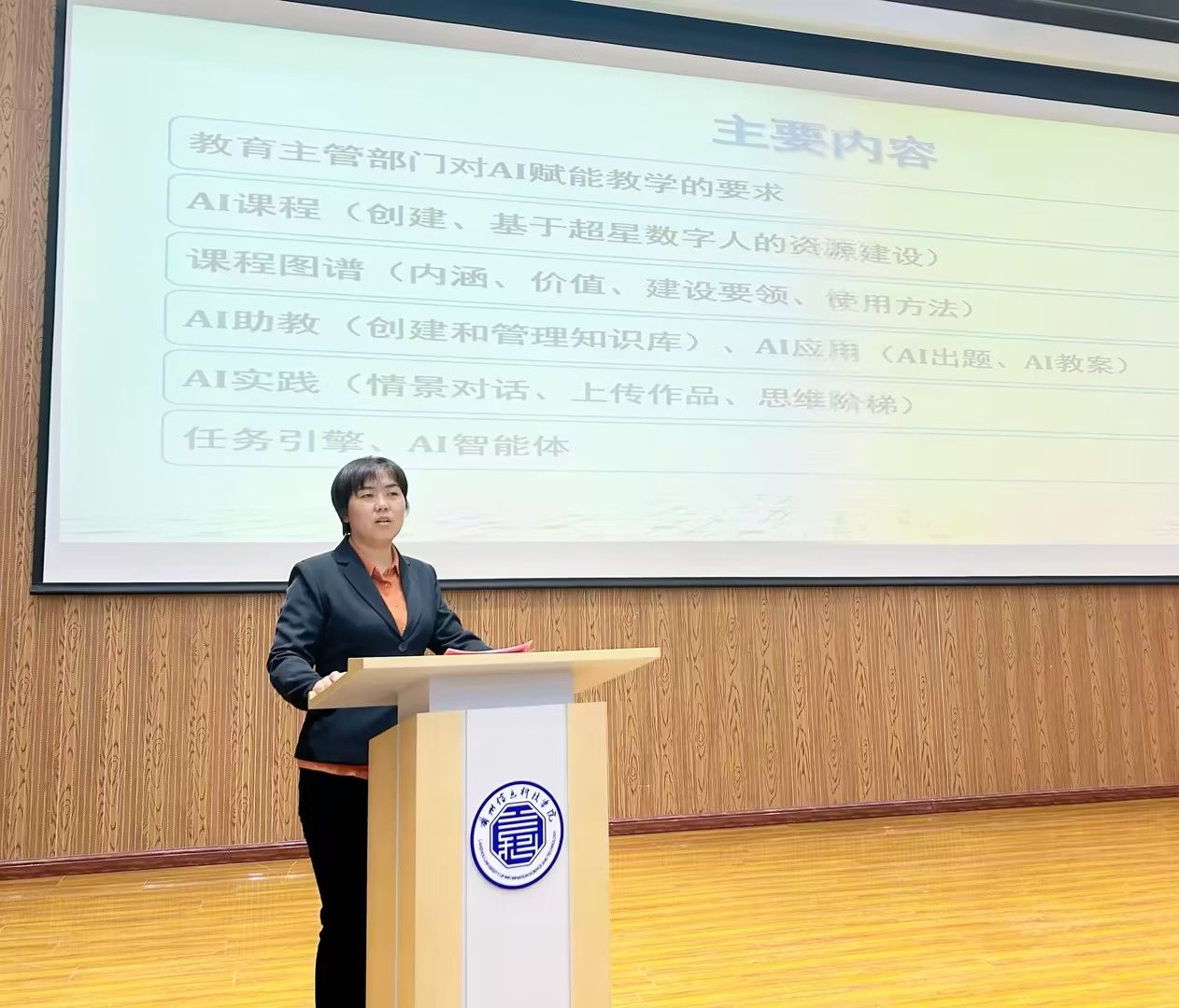 本次转训工作以各二级学院为单位,由参加校级工作坊的骨干教师担任主讲人,培训内容紧密围绕校级工作坊核心要点,涵盖智慧课程概述、课程知识图谱搭建、AI助教实操、AI实践建设与应用等关键模块。转训过程中,主讲教师结合自身参训心得与实操经验,不仅细致讲解超星平台AI助教、智能出题、学情分析等核心功能的操作方法,还通过现场演示、案例分享等方式,让全院教师直观感受数智技术对教学全流程的优化赋能价值。